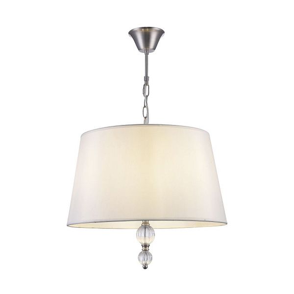 Серия светильников для интерьеров гостиных, спален и офисов в современном стиле. Арматура из метала цвета “никель” дополнена декоративными элементами из прозрачного акрила (шарики). Белые абажуры из текстиля на ПВХ.
