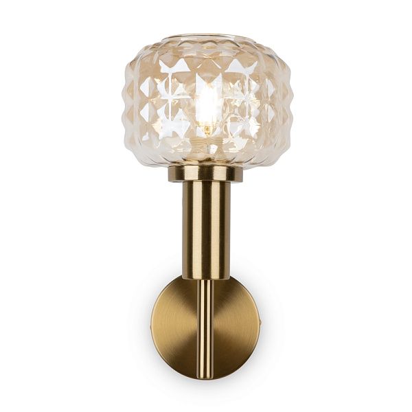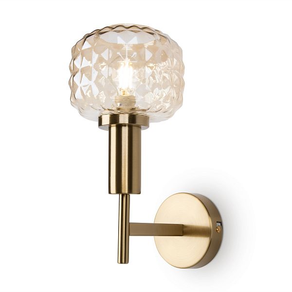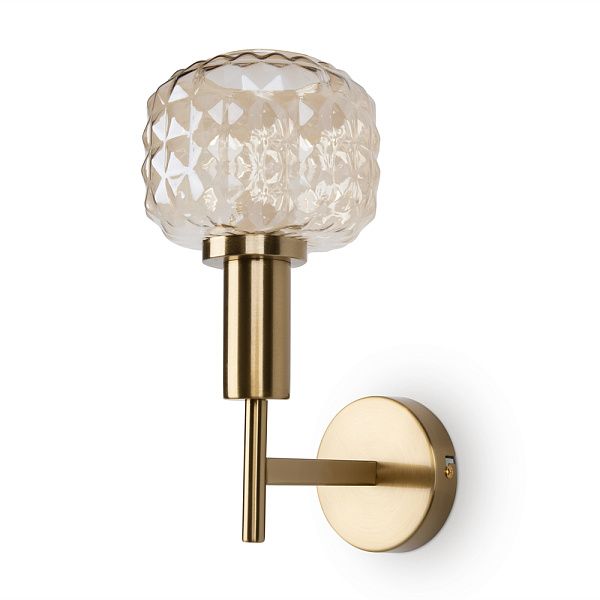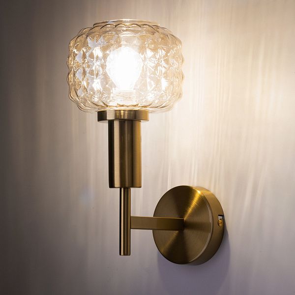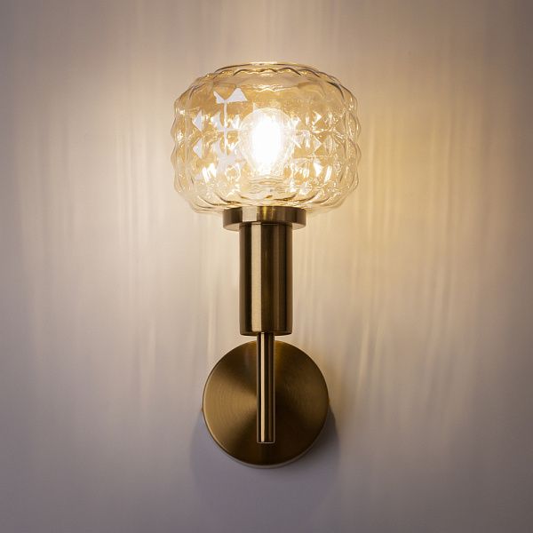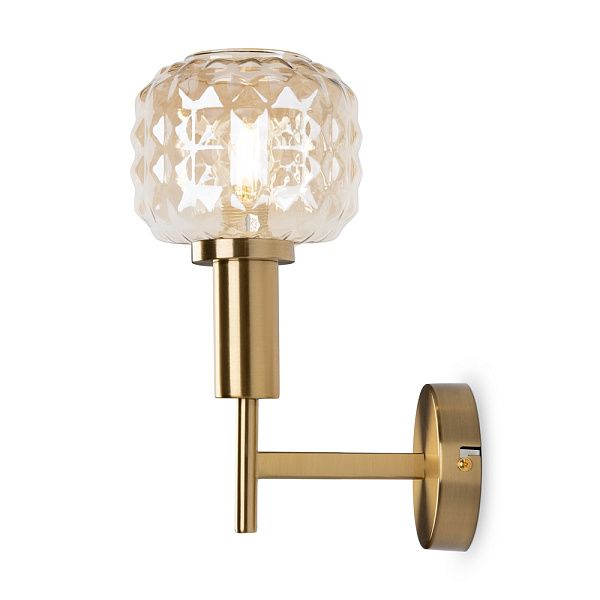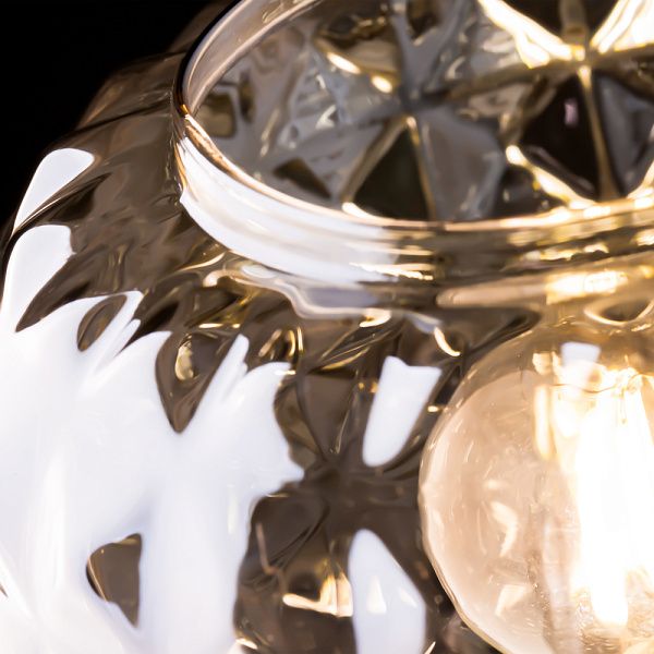 Металлическая арматура в цвете латунь. Плафоны из толстого рельефного стекла в оттенке амбра с «шипованной» огранкой. Подвесные модели регулируется по высоте. Источник света - лампа с цоколем Е14